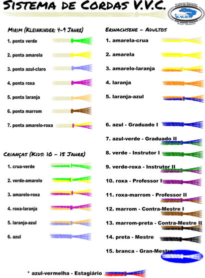 Jede Capoeira-Schule hat das eigene Kordel-System. Bitte beachten, dass unsere Gruppe Anfang 2017 das eigene System aktualisiert hat.
